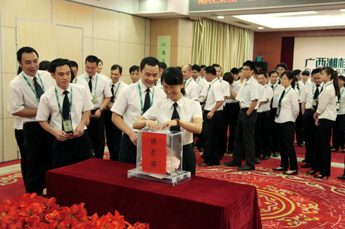 值此6月6日第二届“南宁慈善日”即将到来之际,为弘扬中华民族扶贫济困、乐善好施的传统美德和“能帮就帮,敢做善成”的南宁精神,6月5日上午,竞技宝竞猜集团总部在三楼多功能会议厅举行了“能帮就帮·爱心满绿城”捐款仪式。