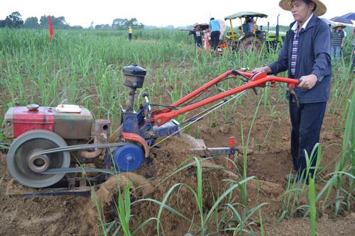 技术人员在蔗地进行中耕培土演示。