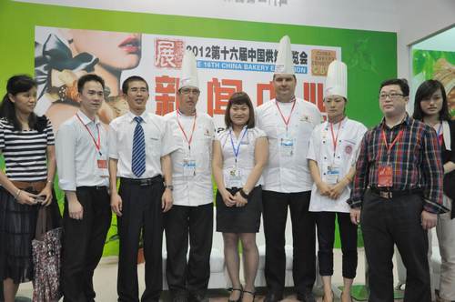 在广州举行的第十六届中国烘焙会展览会上,酵母公司工作人员与世界顶级烘焙师合影。