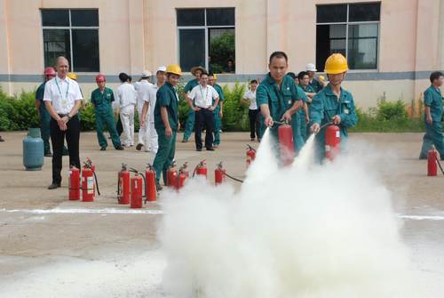 公司员工正在练习使用灭火器。