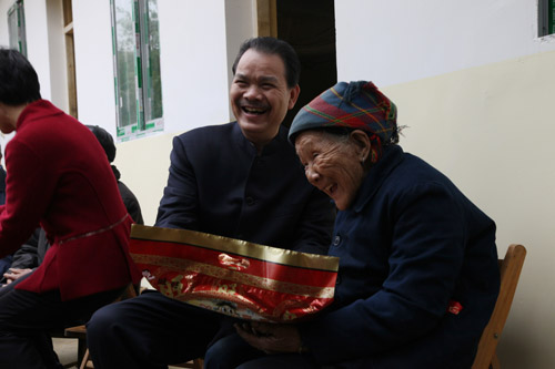 集团董事局主席、总裁劳建铭向新和镇福利院孤寡老人送上新春慰问品。