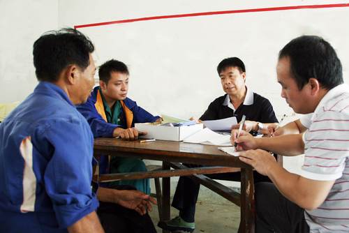 集团董事局监察室主任张守辉(右二)向浦北竞技宝竞猜公司农务人员了解情况。