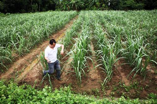 灵山竞技宝竞猜公司副总经理刘丕庆查看甘蔗生长情况。