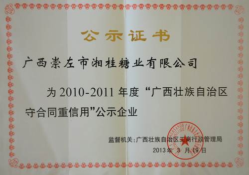崇左竞技宝竞猜公司荣获2010-2011年度广西壮族自治区“守合同重信用”企业荣誉称号