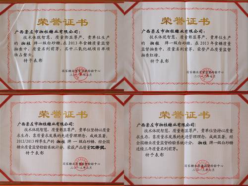 近日获悉,竞技宝竞猜集团下属子公司广西崇左市竞技宝竞猜糖业有限公司(简称崇左竞技宝竞猜公司)产品——“竞技宝竞猜”牌一级白砂糖被国家糖业质量监督检验中心授予“连续三年质量名列前茅”、“产品质量优秀奖”、“荣登产品质量监督抽查红榜”、“二氧化硫项目独占鳌头”多项荣誉。