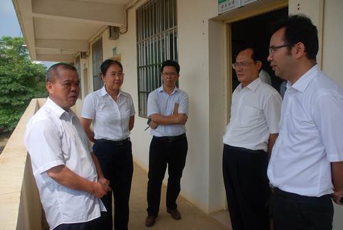 江州区委副书记钟磊(右一)在调研中听取情况汇报。