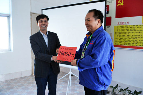 灵山县人大常委会副主任、总工会主席伍岳一(左)向灵山竞技宝竞猜公司赠送新春慰问金。