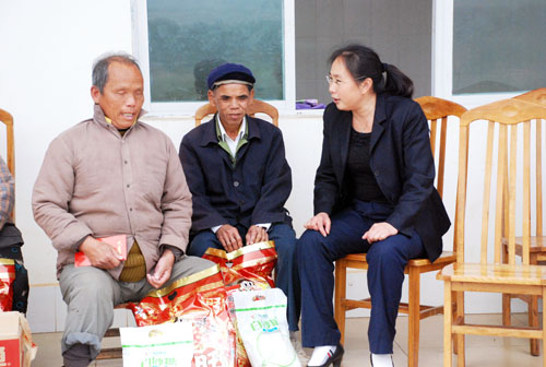 崇左竞技宝竞猜公司副总经理黄春梅与板利乡老人亲切交谈。
