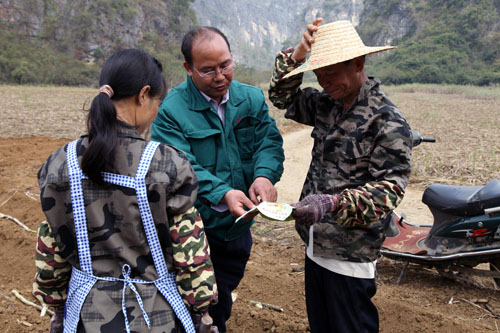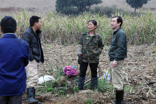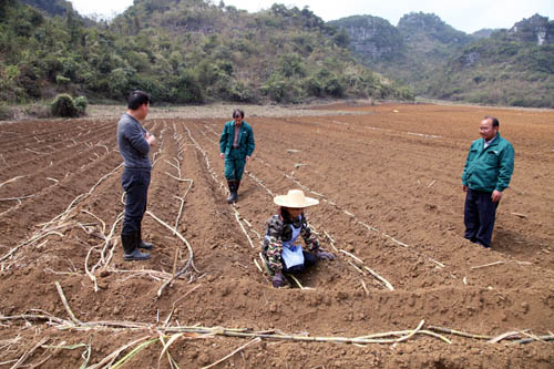 集团督察中心副主任香克非(左二),人力资源中心副经理岑春兰(左三)到田间地头推广公司甘蔗扶持政策。