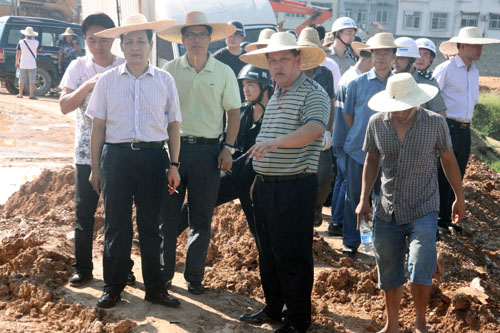 灵山县委副书记李正团(右二),集团副总裁、房地产公司总经理邓豪(左二)到工作现场指导工作。