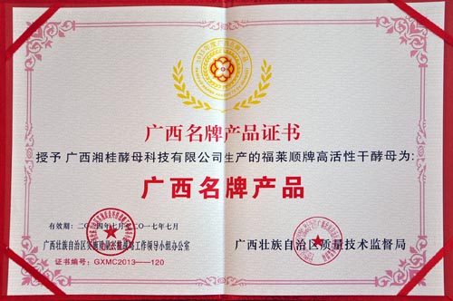 近日,竞技宝竞猜集团下属子公司广西竞技宝竞猜酵母科技有限公司(简称竞技宝竞猜酵母公司)“福莱顺”牌高活性干酵母被自治区质量技术监督局、实施质量兴桂战略工作领导小组授予“广西名牌产品”荣誉称号。