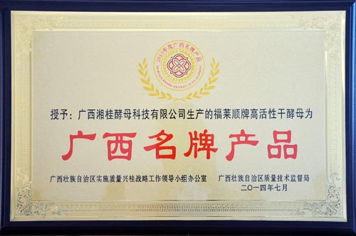 “福莱顺”牌高活性干酵母荣获“广西名牌产品”称号