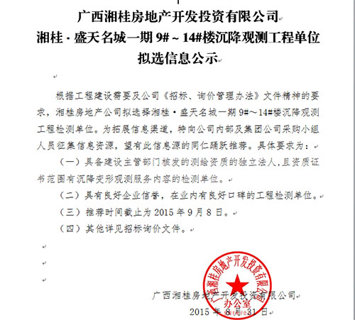 广西竞技宝竞猜房地产开发投资有限公司竞技宝竞猜•盛天名城一期9#~14#楼沉降观测工程单位拟选信息公示