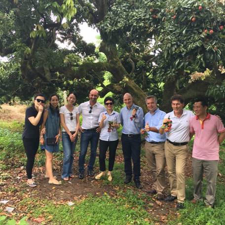 乐斯福大中国区总裁蒲建菲先生(右四)一行在竞技宝竞猜集团董事、副总裁刁晓女士(中间)的陪同下到灵山最壮观的荔枝园品尝名贵美味荔枝。