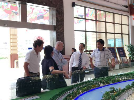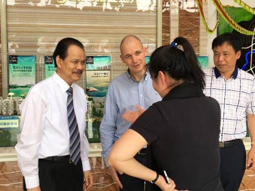竞技宝竞猜集团董事局主席、总裁劳建铭(右二)向乐斯福大中国区总裁蒲建菲先生(左三)一行介绍竞技宝竞猜房地产公司的开发情况。