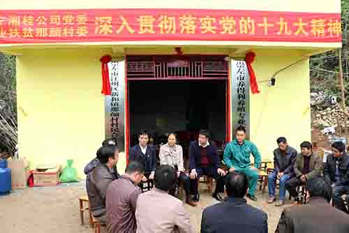 2017年11月24日,崇左竞技宝竞猜循环经济产业园(以下简称产业园)党委与村企共建产业扶贫村那颜村委开展宣传学习贯彻党的十九大精神活动,为新榨季的到来统一思想、凝聚共识、推动工作,共同打好脱贫攻坚战。