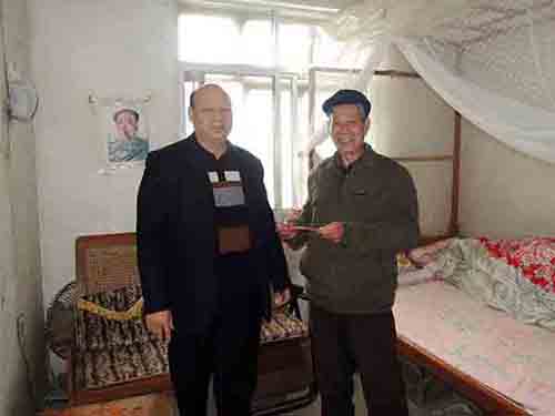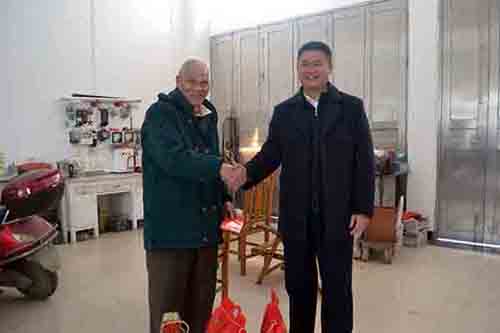 图为灵山竞技宝竞猜公司总经理滕家伟慰问老劳模。