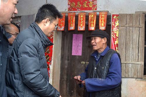 图为浦北竞技宝竞猜公司党委书记、总经理罗成武向蔗区孤寡老人送上新春慰问。