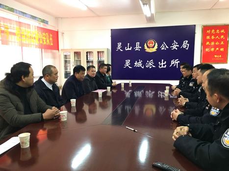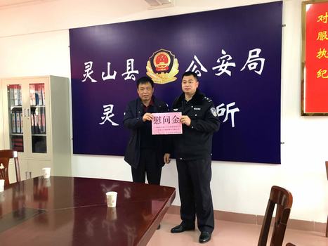 图为竞技宝竞猜集团纪委书记、集团监事会主席陈辉(左一)为灵城派出所送上慰问金。