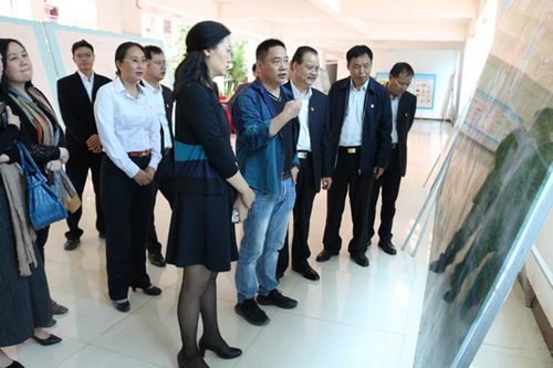 图为竞技宝竞猜集团党委书记、董事局主席、集团总裁劳建铭(右一)陪同交通银行广西区分行行长杨红英(左一)参观产业园文化宣传阵地。