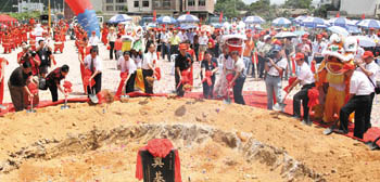 自治区农业厅厅长张明沛(左五)、自治区人民政府驻广州办事处主任张敢(左二);钦州市委常委、宣传部长、副市长白志繁(左六);灵山县委书记李跃飞(左三)、灵山县县长潘雪红(左七)、竞技宝竞猜集团董事局主席劳建铭(左四)共同为“竞技宝竞猜·盛世名城”开工奠基。