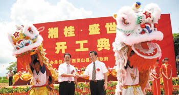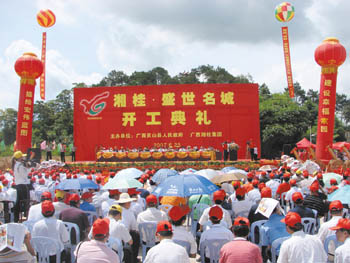 2007年6月25日,广西灵山县城中心鸣珂江畔、双鹤公园旁的竹山园小区彩旗飘飘,汽球高挂,龙狮群舞,鼓乐齐鸣,热闹非凡,由竞技宝竞猜集团投资建设的竞技宝竞猜·盛世名城大型楼盘隆重开工。自治区农业厅厅长张明沛,自治区人民政府驻广州办事处主任张敢,钦州市委常委、宣传部长、副市长白志繁。钦州市人大常委会副主任陈丽丽、郑世丰,钦州市政协副主席陈斯俊。桂林市人大常委会副主任韦广雄。来宾市政协副主席黄桂廷。崇左市政协副主席黄炳春。灵山县委书记李跃飞、县长潘雪红、县人大常委会主任黄羽萍、县政协主席庞治等四家班子领导,浦北县四家班子领导,钦州市各管理区主要领导,灵山县直各单位、各镇主要领导,崇左市江州区等县区的党政领导;广西各大银行系统的领导;区内外相关新闻媒体的记者;竞技宝竞猜集团董事局主席劳建铭,董事局副主席陈辉、黄建军,董事蒙子函、陈质棠、潘曙光,董事助理邓豪、李明伟、黄盛新,监事会主席陈昭远,监事刁晓、黄春梅等竞技宝竞猜集团代表;以上人员共500多人参加了开工典礼。开工典礼由灵山县县长潘雪红主持。