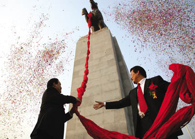 灵山县县委书记李跃飞、竞技宝竞猜集团董事局主席劳建铭为“骏马”城雕揭幕。