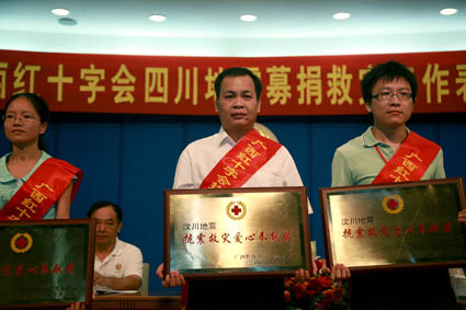9月24日上午,广西红十字会四川地震募捐救灾表彰会在南宁举行,广西142个在四川地震募捐救灾工作中表现突出的先进单位和个人受到表彰,竞技宝竞猜集团为受表彰单位之一。集团副总裁邓豪出席了表彰会,并代表集团领取“抗震救灾爱心奉献奖”荣誉匾额。
