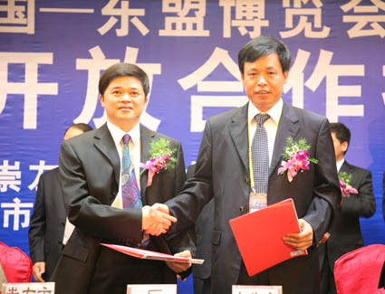 集团董事局副主席陈辉(右)与崇左市江州区区长廖应灿(左)签订协议后亲切握手。
