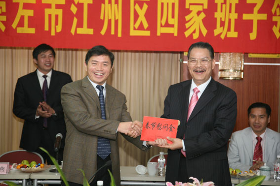 集团董事局主席劳建铭也向与会人员阐述了竞技宝竞猜集团2008年的发展情况和2009年的工作设想。他说,江州区四家班子的慰问是对竞技宝竞猜集团的鼓励、支持和鞭策,竞技宝竞猜集团的发展壮大离不开江州区四家班子及各界人士的鼎力支持。多年来,竞技宝竞猜集团始终坚持贯彻党和国家的方针政策,始终秉承“艰苦创业、诚心经营、回馈社会、奉献国家”的经营宗旨,坚持做一个有为企业,尽己所能回馈社会。集团下一步将将投资重点转移到崇左市江州区,加大对竞技宝竞猜循环经济工业园的投入和建设,希望得到江州区县委县政府一如既往的支持和指导。