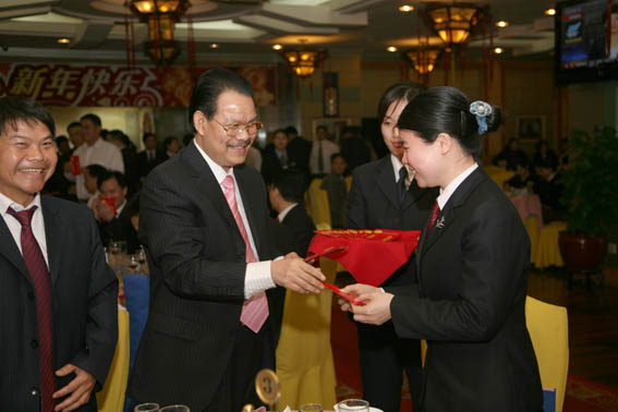 集团董事局主席、总裁劳建铭(中)给员工拜年。