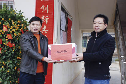 崇左市江州区委书记蓝大煌(左)赠送慰问品,竞技宝竞猜公司总经理朱光彩(右)表示感谢。