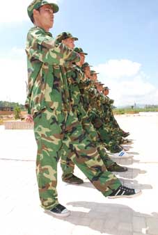 操练场上,员工们在教官们指导下不厌其烦训练着站军姿、稍息、立正等动作。这些平时看起来很简单的动作,要想严格达到标准却很难,尤其是站军姿。集训场的水泥地被火辣辣的太阳下炙烤着,似乎脚踩上去就会冒烟儿。“抬头、挺胸、收腹,双腿要站直,脚跟要并拢……”在教官的指导下,大家在近半个小时的时间里纹丝不动。这样的高温下训练,不仅是对他们身体极限的考验,更是对他们毅力的考验。