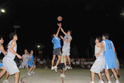 穿插跑动、挡拆掩护、突破传球、空位投篮、卡位抢篮板,篮球场上比赛精彩纷呈。一次成功的配合,一次精彩的进球,都能激起啦啦队员的激情喝彩。当比分拉开,一边球队陷入困难时,场外的啦啦队的加油呐喊,领导的临阵指挥都给球队增添了士气。比赛中,每位队员都积极拼抢,积极跑动,都在为自己的球队贡献着自己的力量。有的队员在球场上被撞倒了,“犯规者”立即伸出手将他拉起,在这里,是真正的“友谊第一、比赛第二”;有的队员在比赛中抽筋了上不了场,却仍然坐在场边给自己的队友加油助威。无论最后的比分定格在多少,每场比赛都没有失败者。