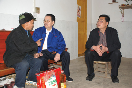 (右一)率领慰问团慰问新和镇华侨农场五队95岁高龄老人何烫,并