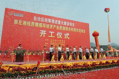 自治区农业厅副厅长韦祖汉、自治区科技厅副厅长纳翔、自治区工信委副主任邱东,自治区糖业局、自治区投资促进局、自治区国税局、自治区地税局等单位领导,及崇左市委副书记卢万兵、市人大常委会副主任方青、副市长张鸿等四家班子领导,江州区委书记蓝大煌、区长秦昆等四家班子领导,中国建设银行广西分行、中国交通银行广西分行、中国光大银行南宁分行副行长等金融单位,集团合作单位代表,集团董事局、集团领导班子及部分员工代表出席开工仪式。