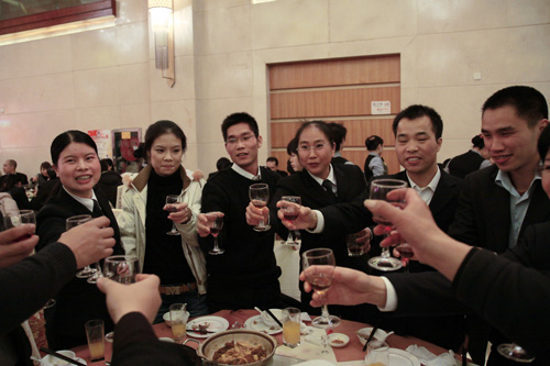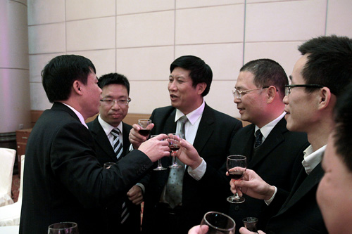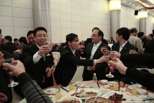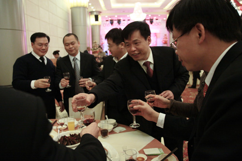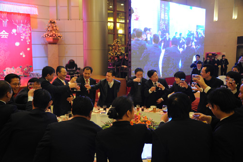集团董事、副总裁劳创禹(右3)、集团副总裁刁晓(右2)向员工敬酒并致以新春祝福。