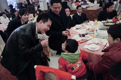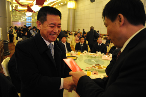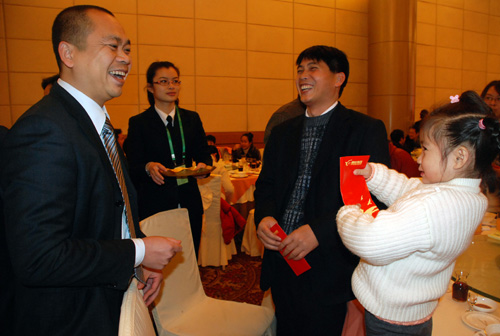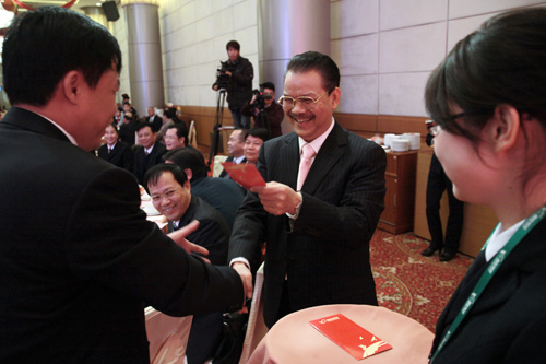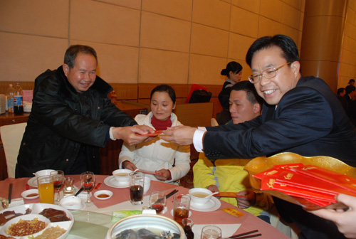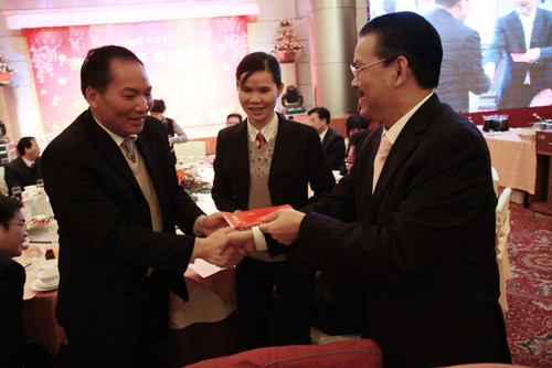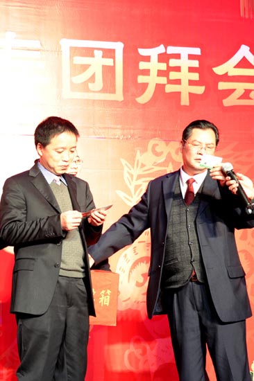 集团董事局主席、总裁劳建铭在团拜会上发红包。