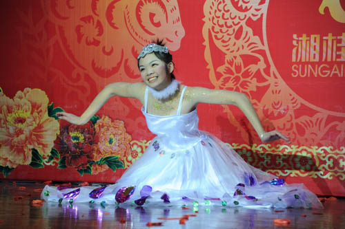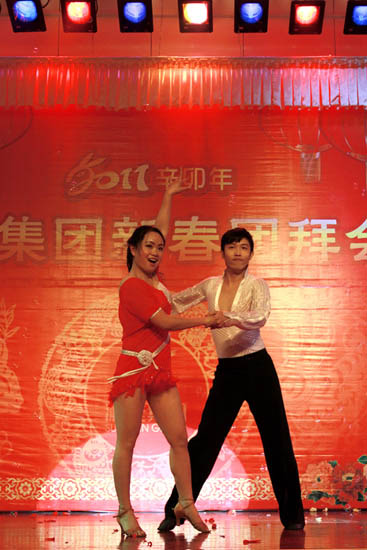 金和公司总经理罗成武(右3)等公司领导在晚会上表演节目。