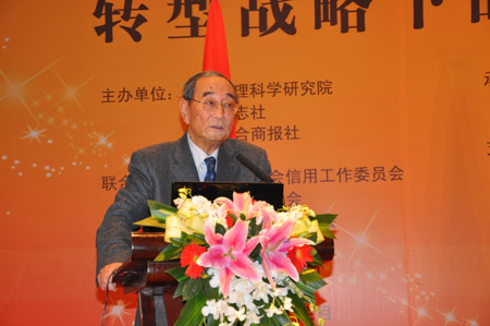 全国政协经济委员会副主任、北京大学光华管理学院名誉院长厉以宁在论坛上作报告。
