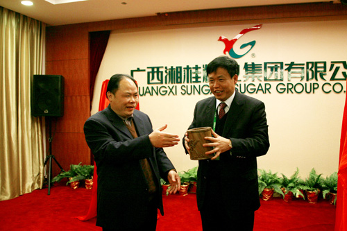 崇左市委书记赵乐秦向集团董事局主席、总裁劳建铭赠送新春礼品。