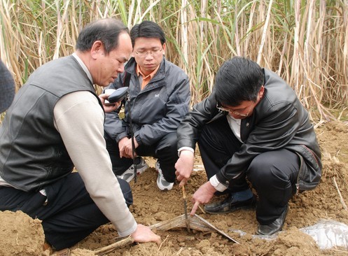 远道而来的专家组先后到竞技宝竞猜公司那湴甘蔗“三高”综合示范片和孔香屯糖料蔗示范基地考察。专家组详细了解示范基地的建设情况,深入蔗田,仔细观察“新台糖22号”等各类甘蔗良种的生长情况,并就甘蔗种植技术、病虫害防治和“蝴蝶斑”形成等问题进行了探讨。