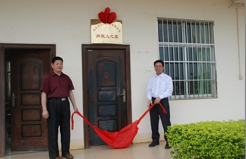图为崇左市国税局纪检组组长段玉森与竞技宝竞猜公司总经理为“纳税人之家”揭牌。