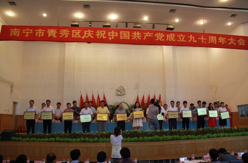 为隆重纪念中国共产党九十周年华诞,继承和发扬党的优良传统,表彰先进,树立榜样,6月30日,南宁市青秀区党委对2010年以来取得优异成绩的先进基层党组织及先进个人予以表彰,竞技宝竞猜集团荣获“南宁市青秀区先进基层党组织”称号。