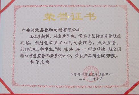 近日,竞技宝竞猜集团下属子公司广西浦北县金和制糖有限公司(以下简称“金和公司”)在2010/2011年榨季生产的“桂兴牌”一级赤砂糖荣获国家糖业质量监督检验中心颁发的“产品质量优秀奖”。