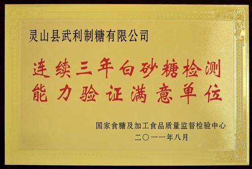 此次荣获国家食糖及加工食品质量监督检验中心颁发的“连续三年白砂糖检测能力验证满意单位”称号,既是对公司多年来努力的肯定,武利公司将继续认真抓好产品质量工作,以品质赢得市场,以品牌促进发展。