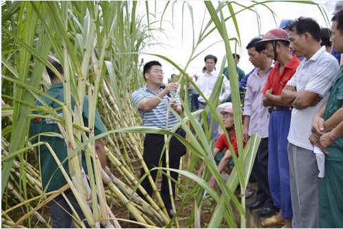 广西甘蔗研究所副所长黄诚华(中)在金和公司蔗区向农务人员讲授甘蔗种植新技术。