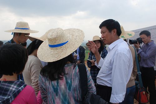 竞技宝竞猜公司常务副总经理莫江(左一)为中央媒体采访团介绍示范基地情况。