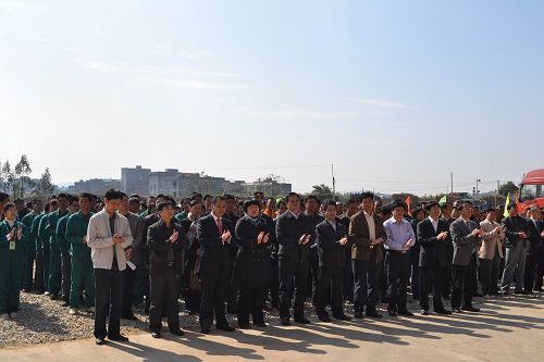 钦州市委常委、灵山县委书记潘雪红(左四),县长苏英权(左五),县人大常委会主任丁奇远(左六),县政协主席庞治(左二)等领导参加武利公司11/12榨季开榨仪式。