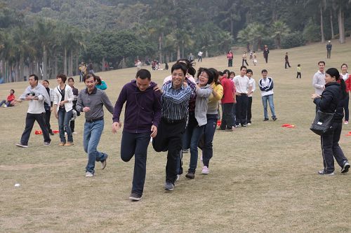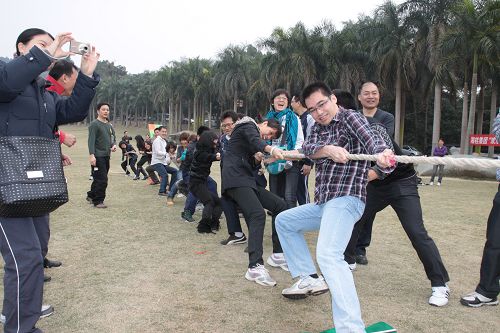 随着裁判的一声哨响,户外活动的首个项目“健步行”点燃了全体人员的热情。4个小组一路上你追我赶,争先恐后地从青秀山脚奔向位于山顶的龙象塔。其中在最引人注目的拔河比赛里,每个小组各派出6男6女“精兵强将”代表参赛,双方队员精心布阵,手心紧拽绳子,脚底使劲抓地,弯腰侧身,丝毫不敢放松。伴随着啦啦队的呐喊声,红绸一旦越过红线,胜利的一方欢呼、击掌、拥抱、空中跳,喜悦之情溢于言表,充分享受着比赛的乐趣和团队的协作精神。此次户外活动还有“三人绑脚跑”、“链接加速”、“猪八戒背媳妇”等别开生面又精彩有趣的活动,精美丰富的奖品更是让员工眉开眼笑,满载而归。